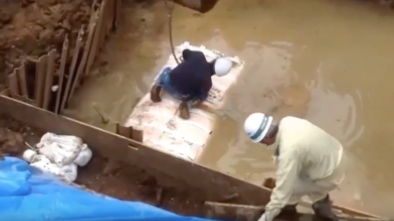 動画から分かるように、水浸状態の軟弱な基礎地盤でしたので、まずD・Box-LS100を1段設置し、その後もう1段設置して、重機のバッケットで加圧して基礎地盤の圧密を促進させました。