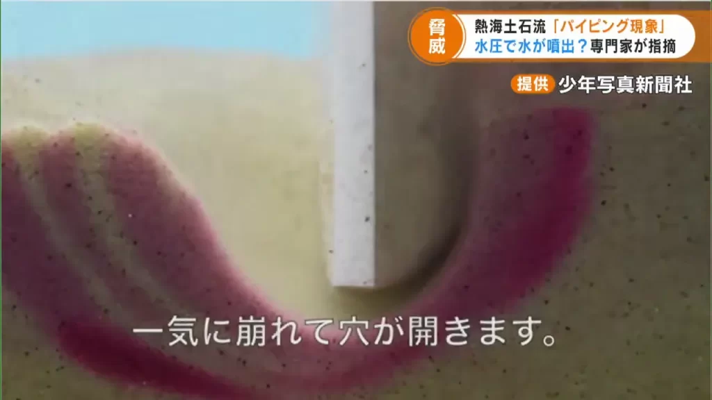 その盛り土が土石流になった原因として、「パイピング現象」という自然現象が考えられています。