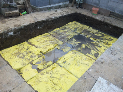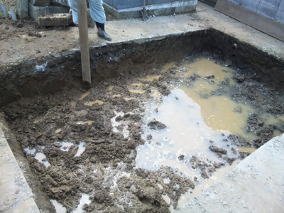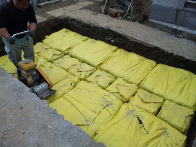 D・Box-SS90, 45による墓石基礎地盤(水浸状態)の補強の様子