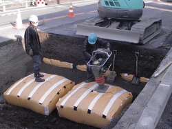 大型ソイルバッグ(D・Box)の使用は、セメント等による地盤改良よりも、はるかに安定して手軽な工法です。