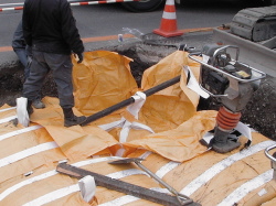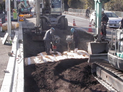 北海道にて、高規格土のう「ソイルバッグ工法」による、道路の振動低減・地盤沈下抑制の対策工事を実施しました。