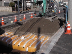 動画から分かるように、水浸状態の軟弱な基礎地盤でしたので、まずD・Box-LS100を1段設置し、その後もう1段設置して、重機のバッケットで加圧して基礎地盤の圧密を促進させました。
